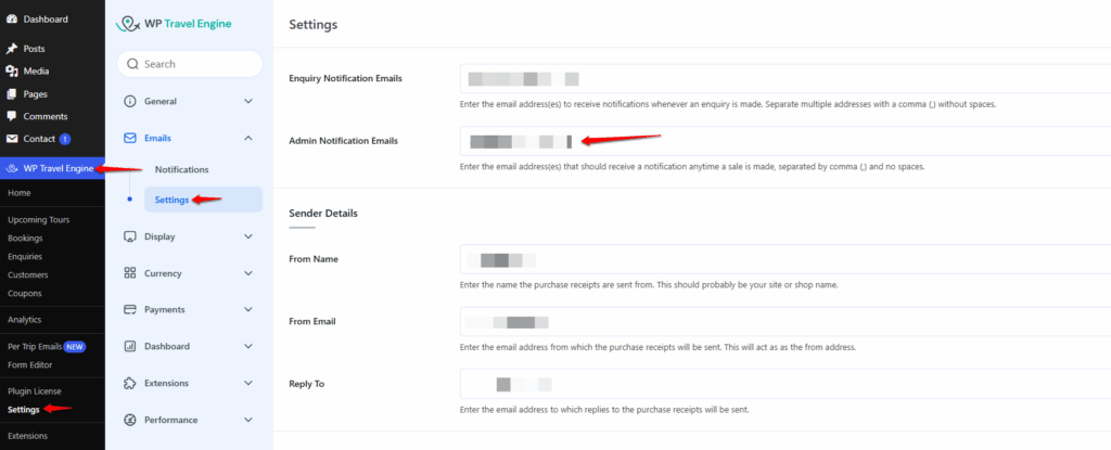 To add Admin Notification Email, navigate to Dashboard > WP Travel Engine > Settings > Emails > Settings.