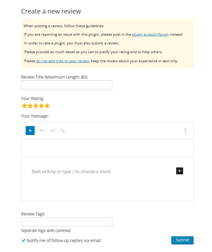 - Your review will be sent, and it might take some time to appear on the plugin page.
