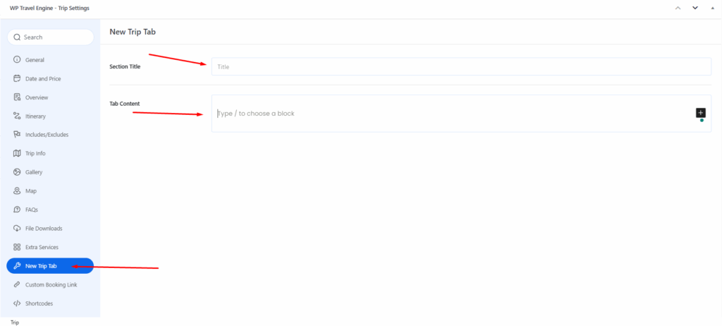 - Navigate to WP Travel Engine > Settings > General > Trip Settings > Trip Tabs.