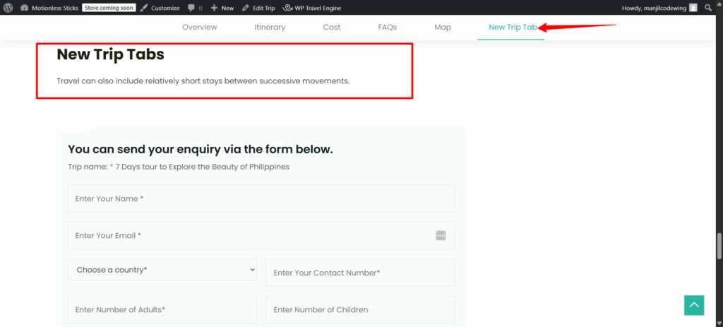 Your new tab will now appear on the single trip page with the content you added.