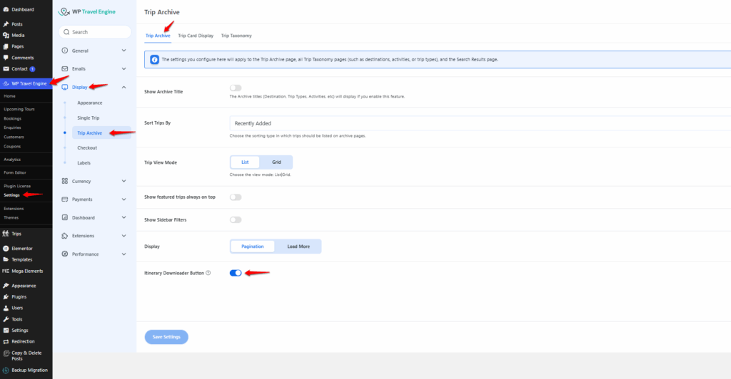 - In the WordPress Admin Dashboard, go to WP Travel Engine > Settings > Display > Trip Archive.