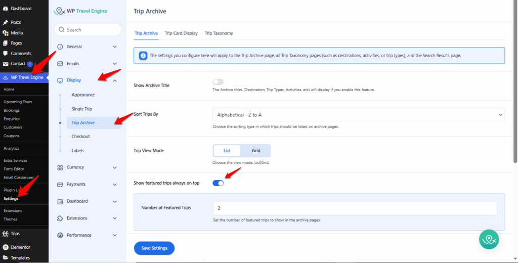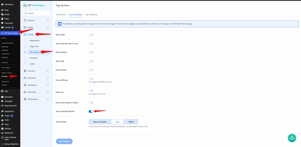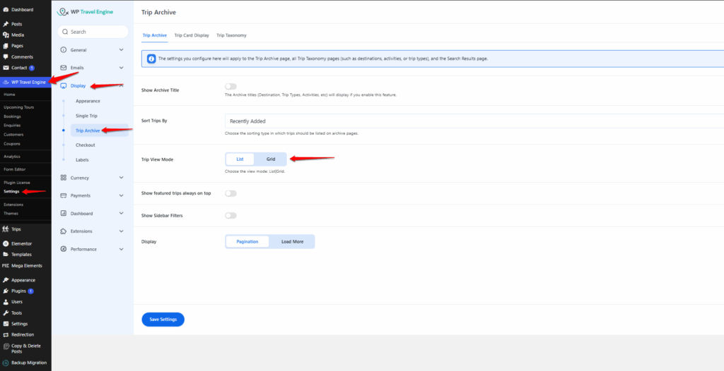 - In the WordPress Admin Dashboard, go to WP Travel Engine > Settings > Display > Trip Archive.