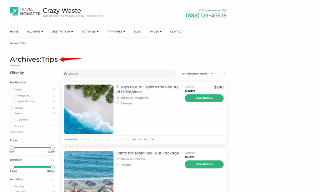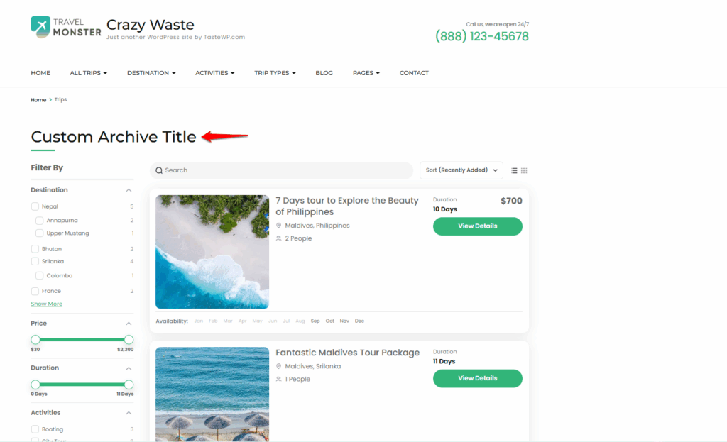 You can enable the archive title on the Trip Search / Archive Page to display titles such as Destination, Trip Types, Activities, and more. This helps users clearly identify which archive or category page they are viewing.