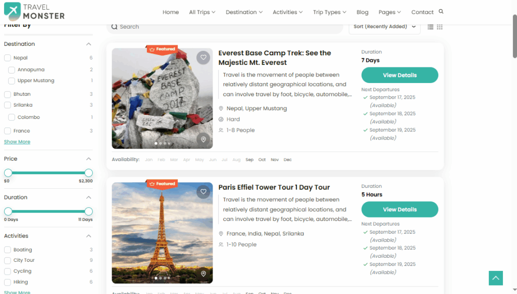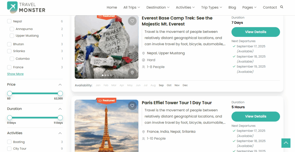 The Trip Archive Page displays all published trips in a structured layout. Users can browse, filter, and search trips by categories, destinations, price, and other criteria. This improves navigation, enhances search visibility, and helps visitors quickly find suitable trips.