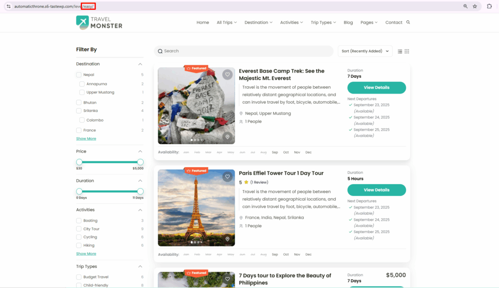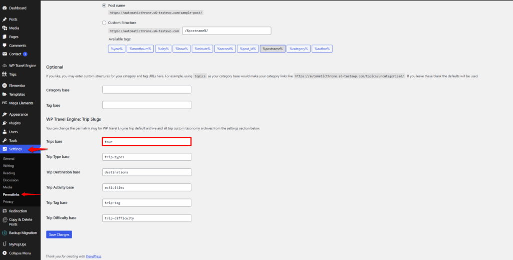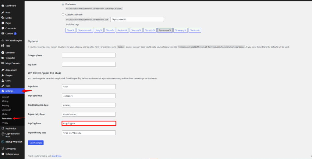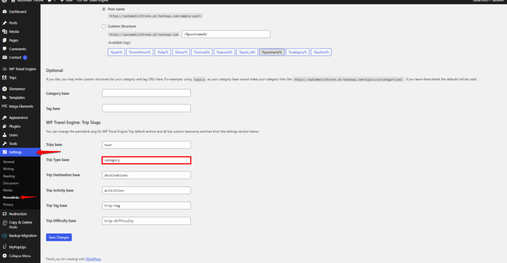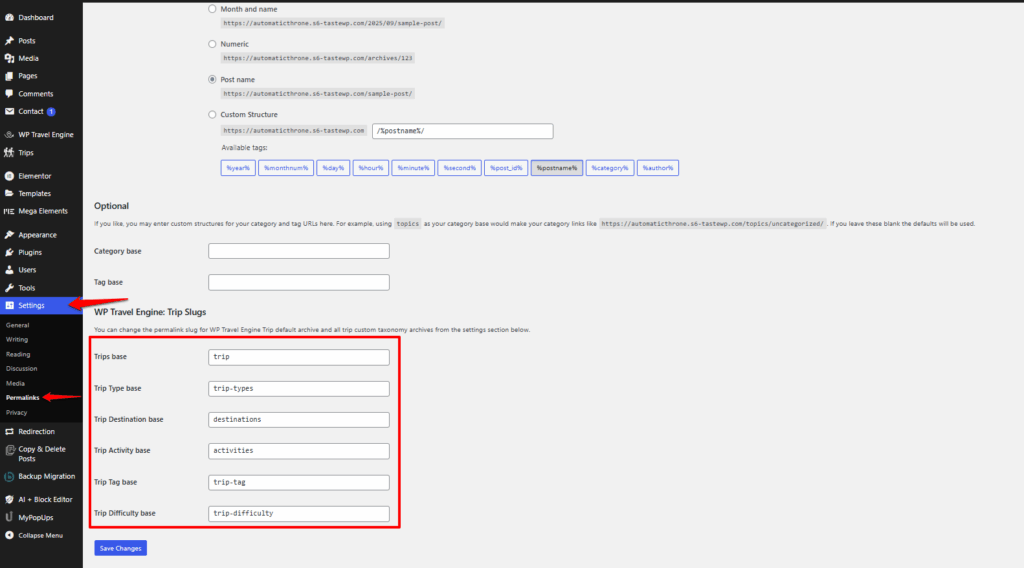 To customize the trip slugs, navigate to WordPress Dashboard → Settings → WP Travel Engine: Trip Slugs. There you can edit the base slugs:
