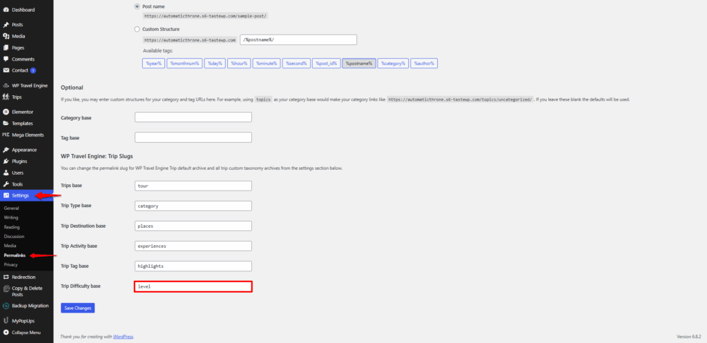 To change the Trip Difficulty base slug, you can enter a custom term to organize trips based on difficulty (e.g., level, difficulty).