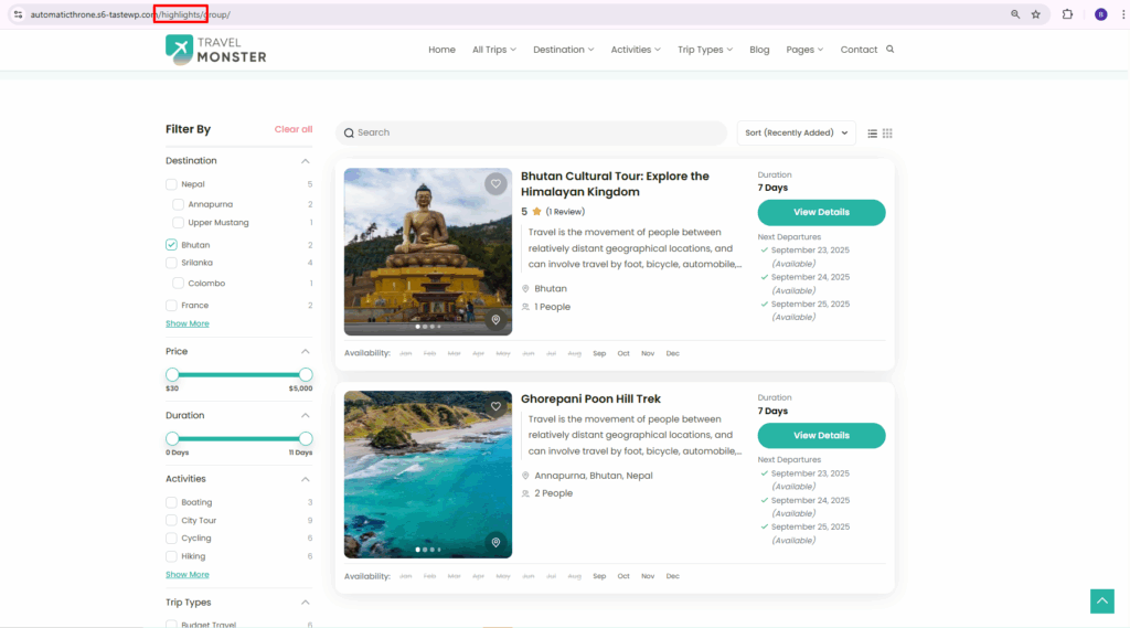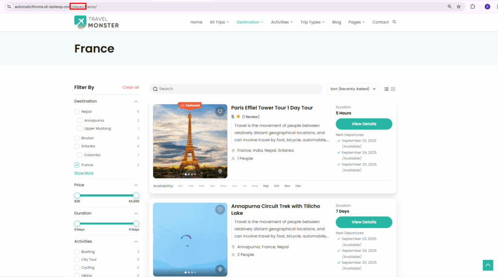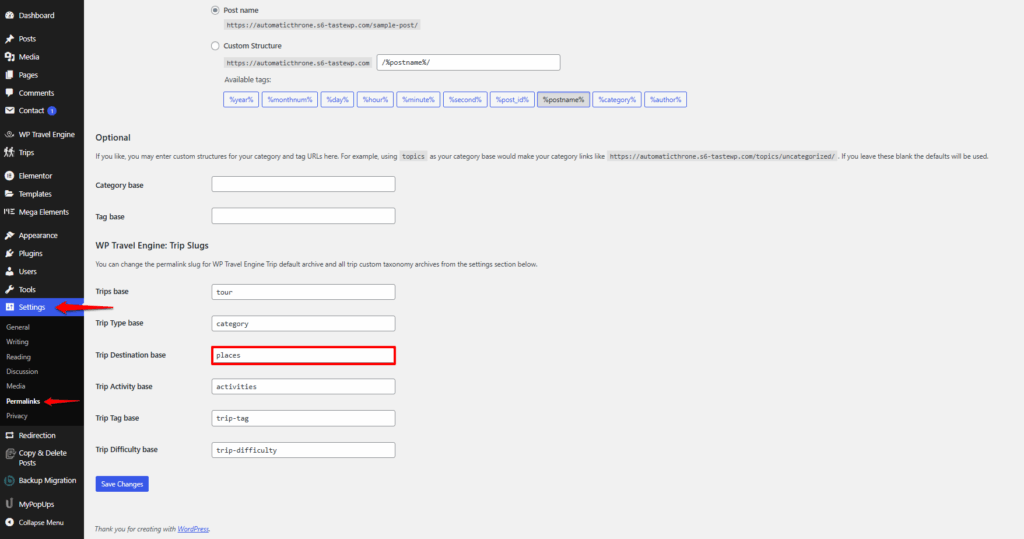 You can change the Trip Destination base slug by entering a custom term that makes location-based URLs clearer (e.g., destination, places).