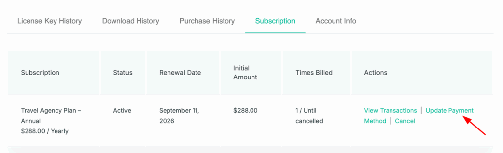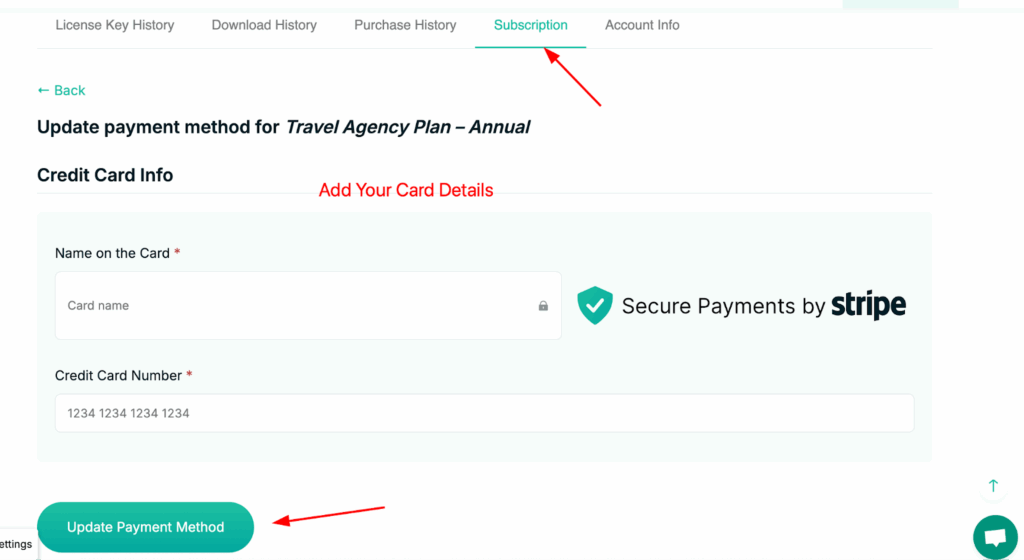 Keeping your payment information up to date ensures that your WP Travel Engine subscription renewals are processed smoothly and without interruption. Updating your credit card details is simple and follows a process similar to managing your subscription.