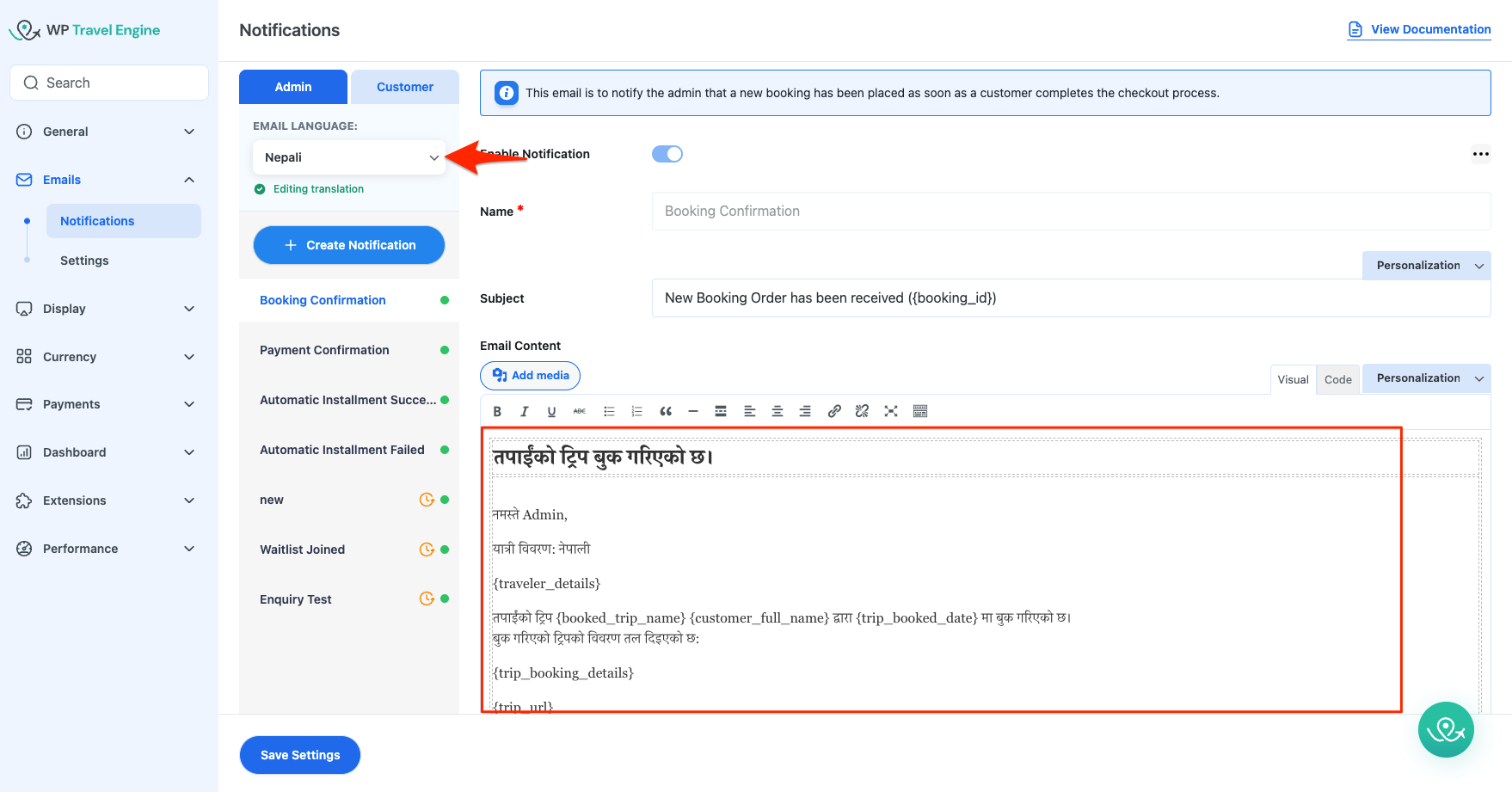 Configure Email Translation for WP Travel Engine #