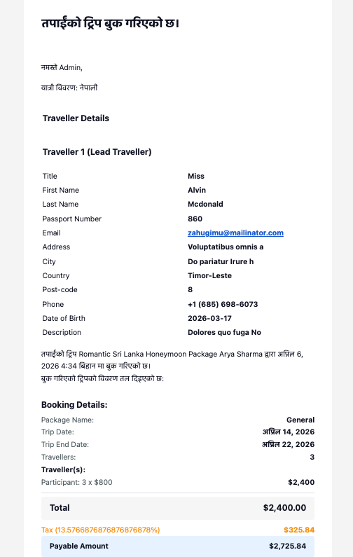 - Dynamic information such as trip name, customer name, and booking details displays correctly.