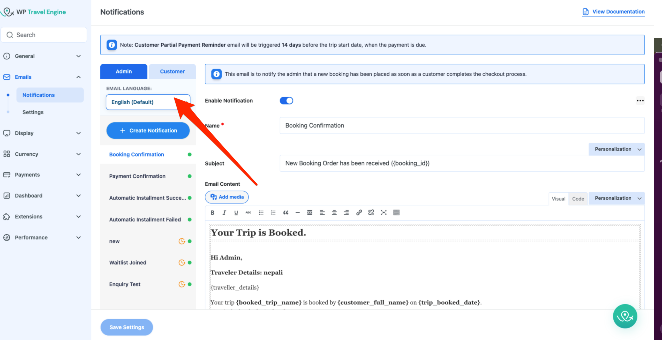 - Go to WP Travel Engine → Settings → Extensions → Emails → Notifications.
