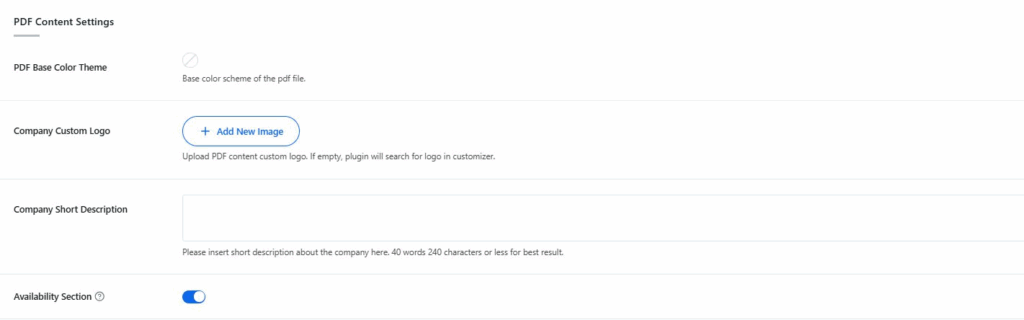 - Company Short Description: Add a short description of your company. This will appear inside the PDF as an introduction.