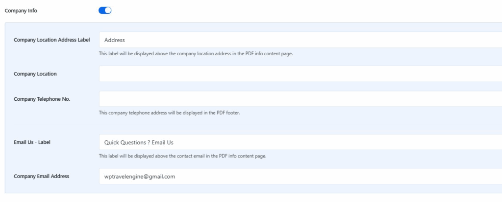 Once you enable the Company Info toggle, you will find the settings below. These settings allow you to display your company contact details inside the PDF brochure.