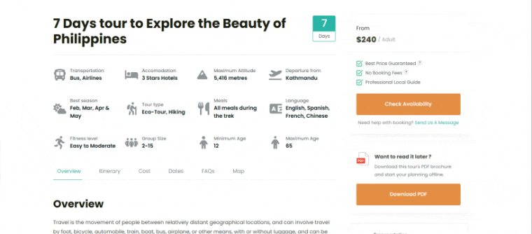 Now, on the frontend, visitors will see the Download PDF button on the trip page.