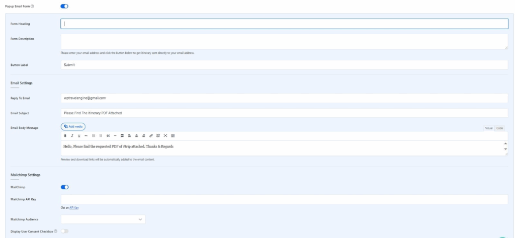 When you enable the Popup Email Form, travelers will be required to enter their email address before they can download the itinerary PDF.