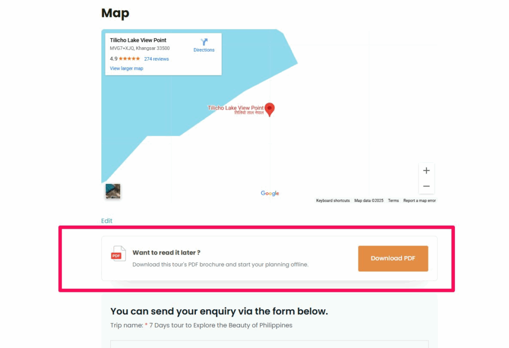 If you prefer to have the download button placed above the enquiry form in the sidebar of the single trip page, this option allows you to do so. By enabling this, the “Download PDF” button will be shown right above the trip’s enquiry form, providing easy access for users who are interested in downloading the itinerary before they make an inquiry or request more details.