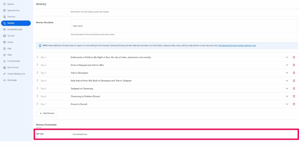 The Itinerary Downloader is a WordPress plugin extension that generates downloadable PDF brochures for your trip. Visitors can download trip details directly from your site, save them for later, or share them with others.