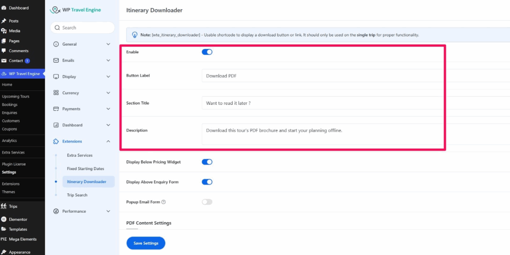 You can configure the add-on by going to: Dashboard → WP Travel Engine → Settings → Extensions → Itinerary Downloader