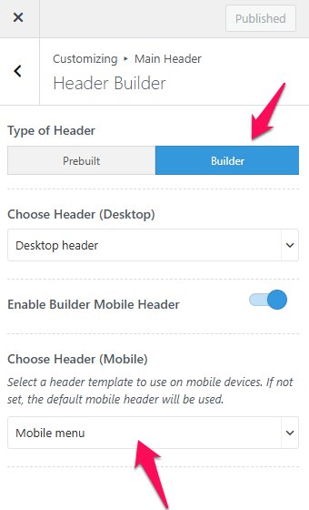 Once you’re done designing, the custom header will automatically apply if you’ve selected “Builder” as the layout option in the Customizer Settings: