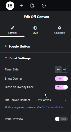 - Create the panel layout in Off Canvas Builder