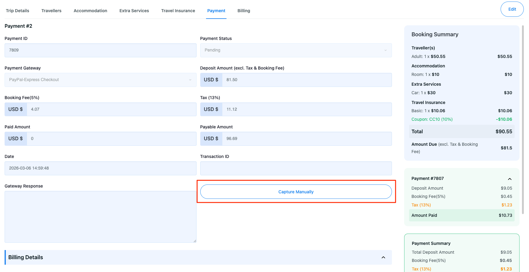 When this happens, WP Travel Engine provides a Capture Manually option inside the booking dashboard so the admin can capture the payment manually.
