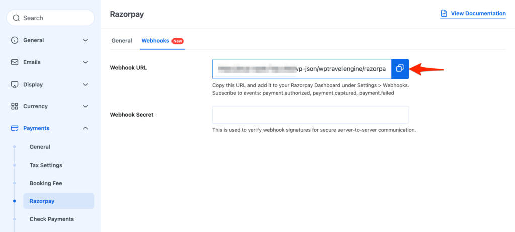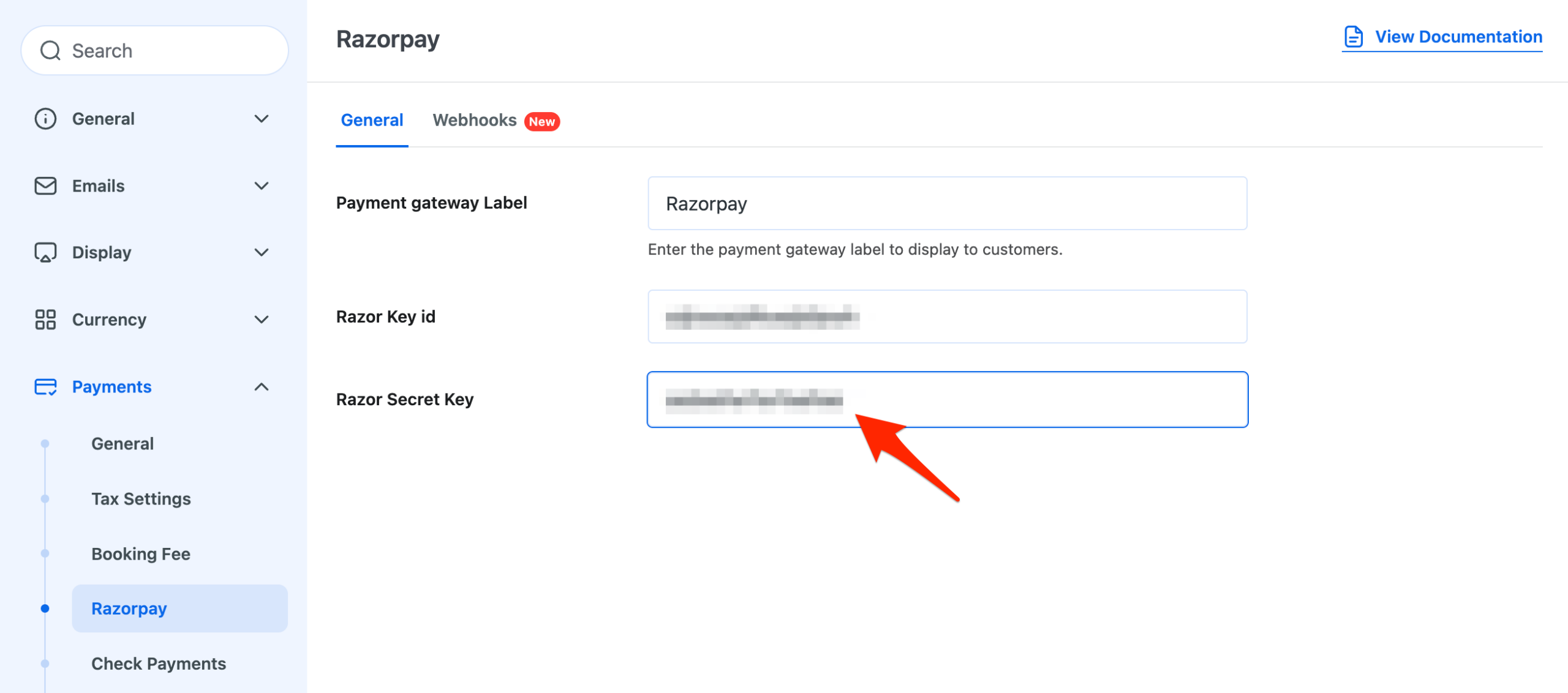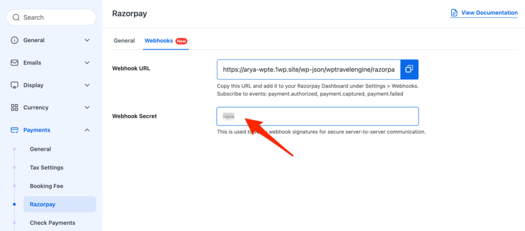 - Return to your Razorpay add-on settings on your site and paste the same Secret Key you used when creating the webhook.