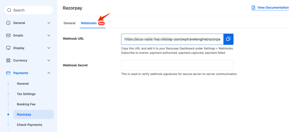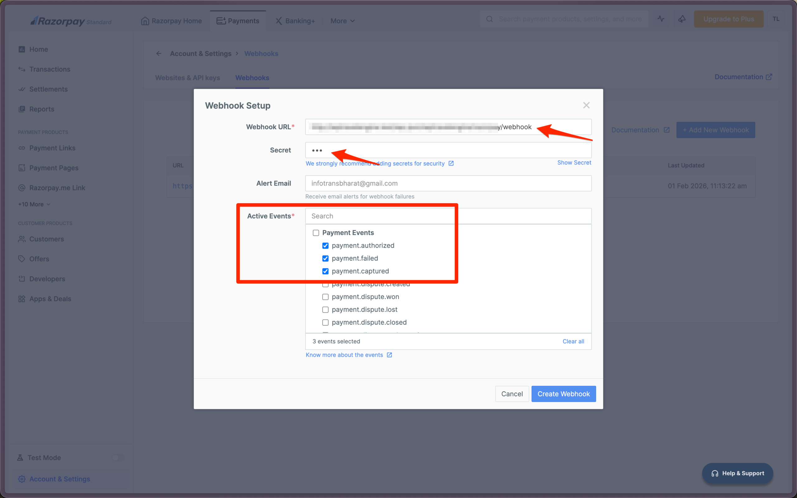 payment.authorized,payment.captured,payment.failed. - Click Create Webhook.