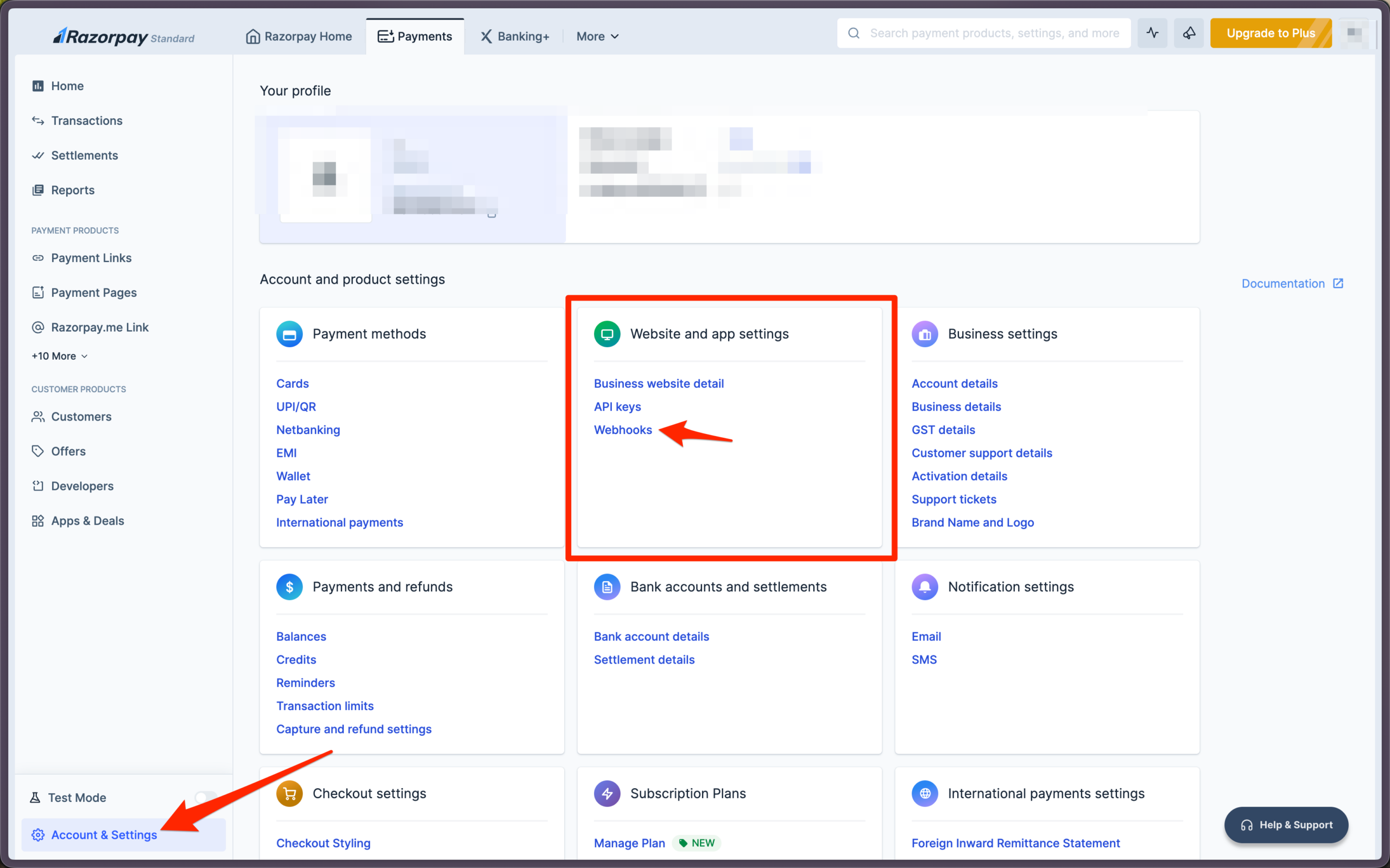 - Under Website and app settings, click Webhooks.
