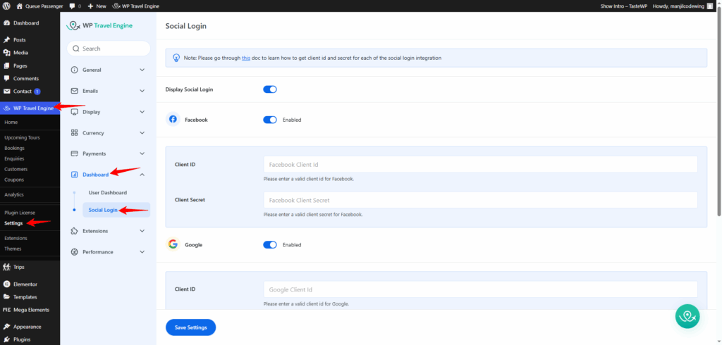 You can access the Social Login Settings via Admin Dashboard > WP Travel Engine > Settings > Dashboard > Social Login.