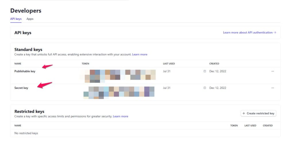 Log in to the Stripe Dashboard, go to Developers > API keys to access both your Publishable and Secret keys.