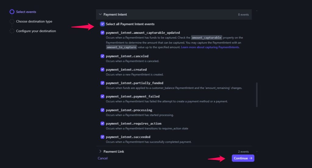 - When adding the webhook endpoint, select only the Payment Intent and all the Payment Intent Events.