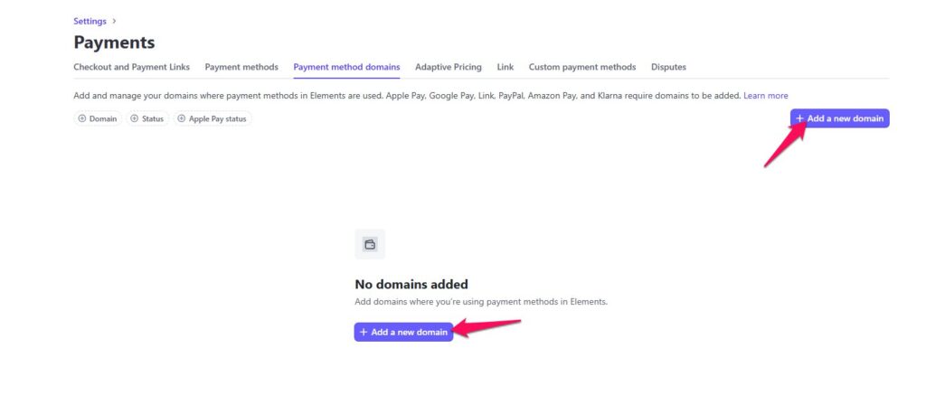 - To enable Apple Pay, you’ll need to register your domain or subdomain in the Stripe Dashboard under Payment (Settings). Please refer to the screenshot below for detailed instructions.