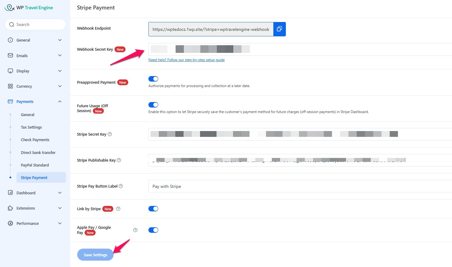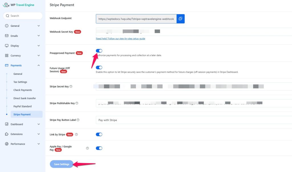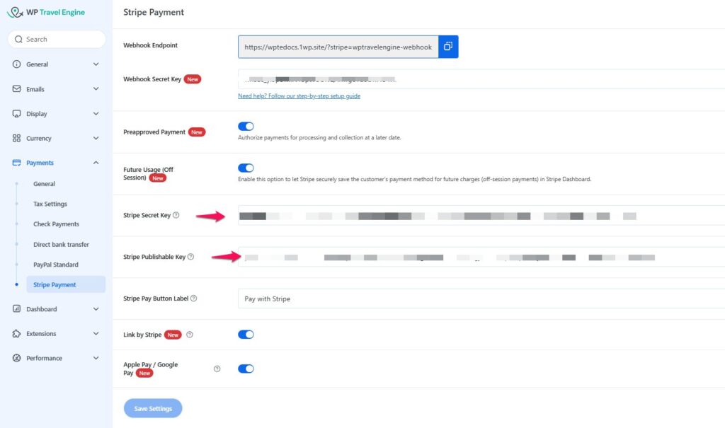 - Go to WP Travel Engine > Settings > Payment > Stripe Payment.