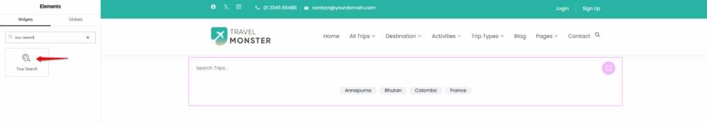 The Tour Search Widget allows visitors to quickly search and filter trips on your travel website. To use this widget, you must first install and activate the WP Travel Engine – Elementor Widgets plugin.