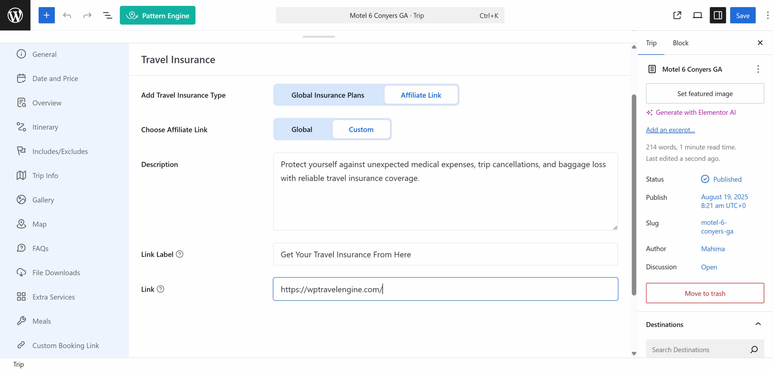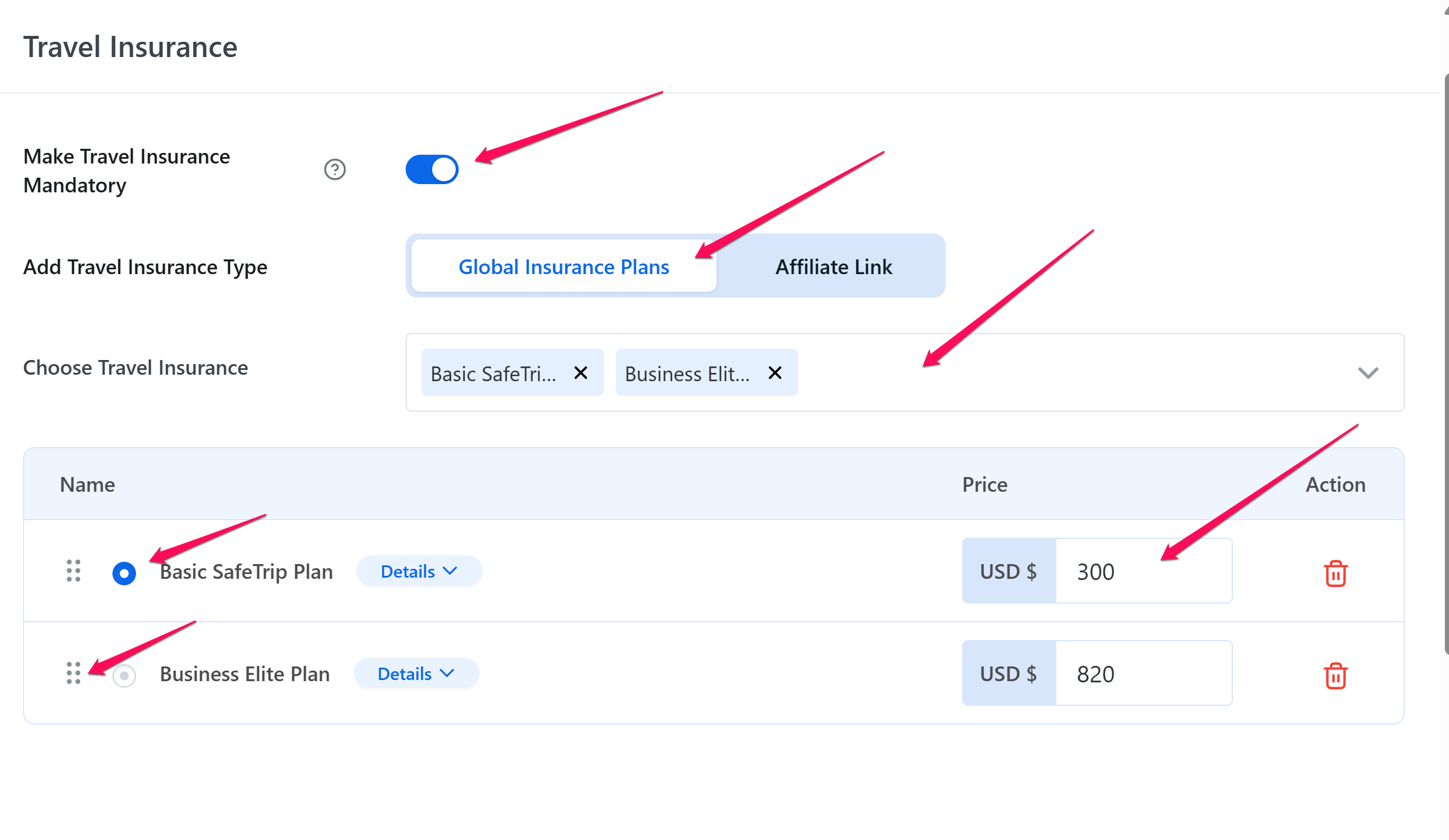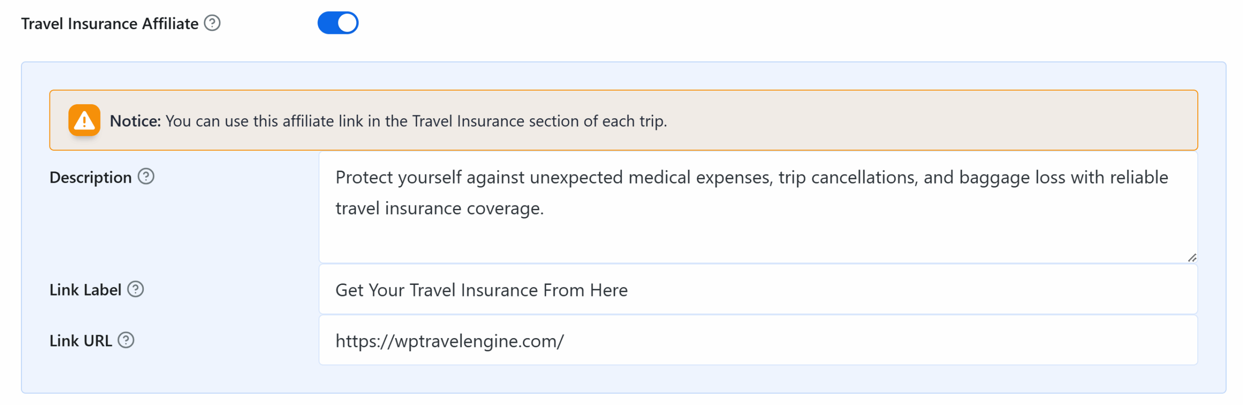 - Travel Insurance Affiliate: Enable this toggle to configure a Global Affiliate Link for travel insurance.