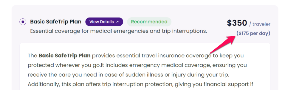 - Show Per-Day Pricing: Enable this option to show a pricing breakdown per day within the insurance details. This makes it easier for travelers to understand the cost.