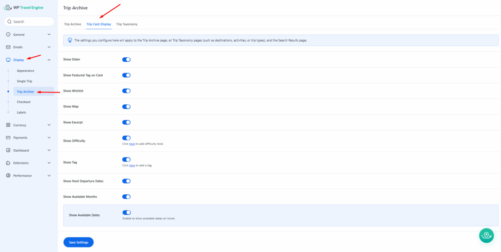 To access these settings, please go to the WordPress Admin Dashboard and navigate to WP Travel Engine > Settings > Display > Trip Archive > Trip Card Display.