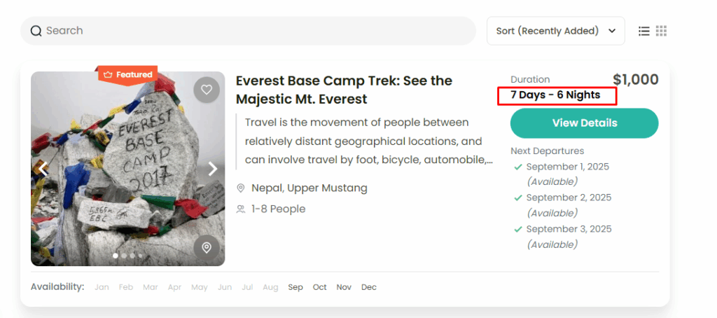 - Days and Nights: e.g., 7 Days / 6 Nights