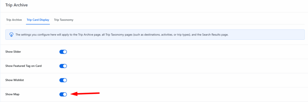 - Enable this option: A map icon will appear on the trip card. When clicked, a map of the trip’s location will be displayed on the individual trip page.