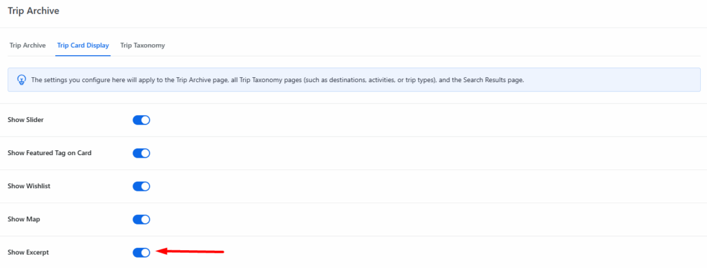 Enable this option: The excerpt option will display a short summary or excerpt from the trip description on the trip card.