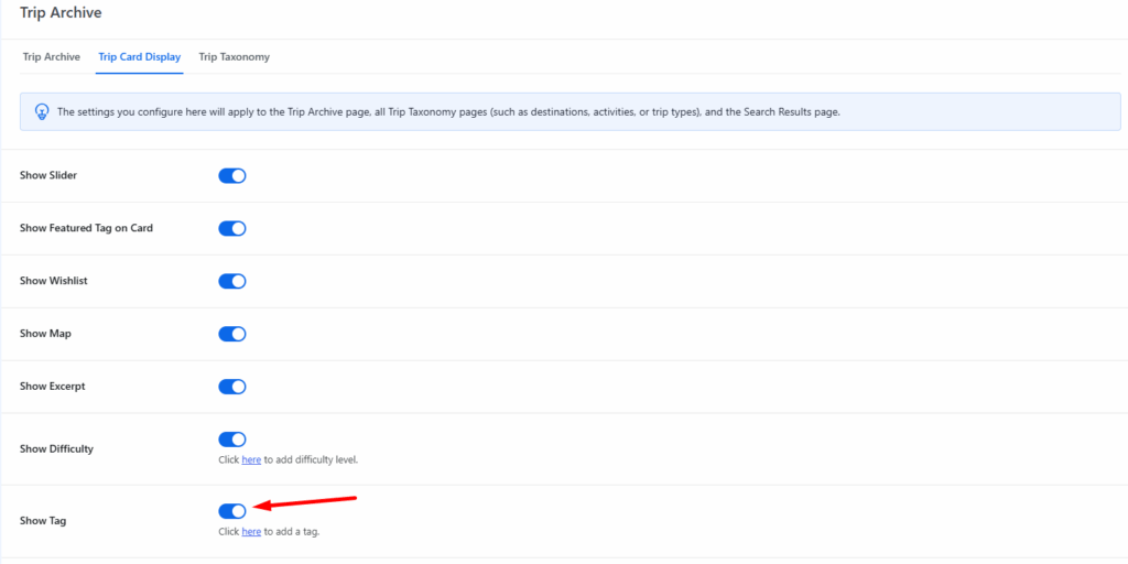 - Enable this option: Tags associated with the trip will be shown on the trip card (e.g., Adventure, Family-friendly, etc.).