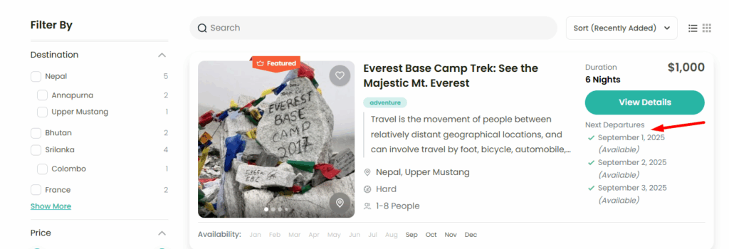 - Enable this option: The next available departure dates will be shown on the trip card.