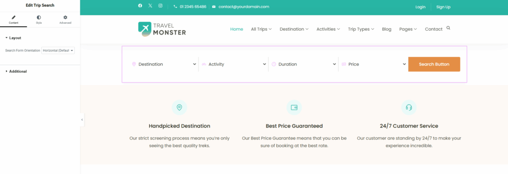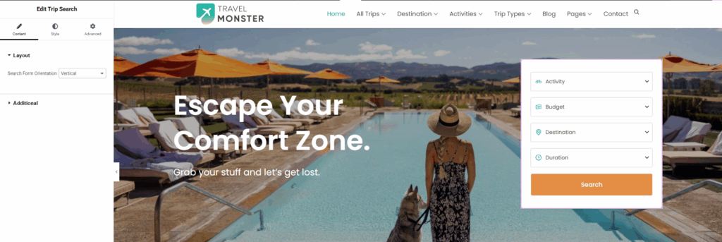 You can add the Trip Search Widget using the Elementor plugin. This widget allows visitors to easily search and filter trips on your travel website.